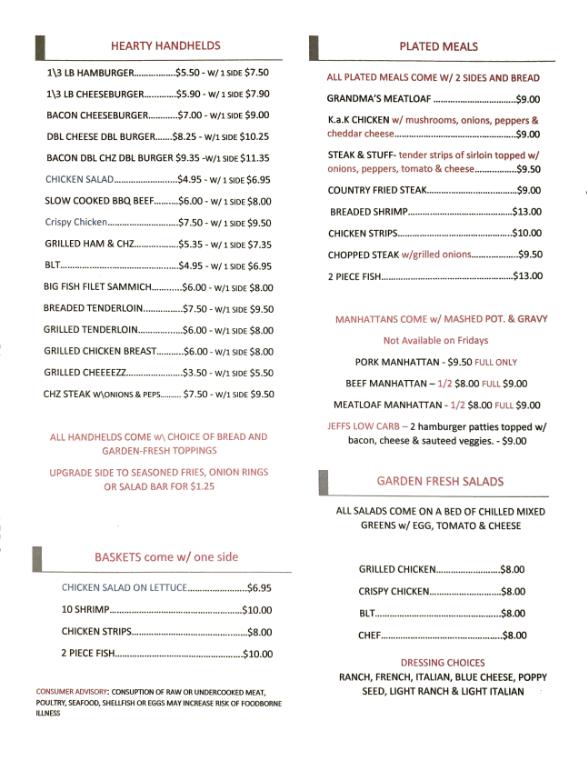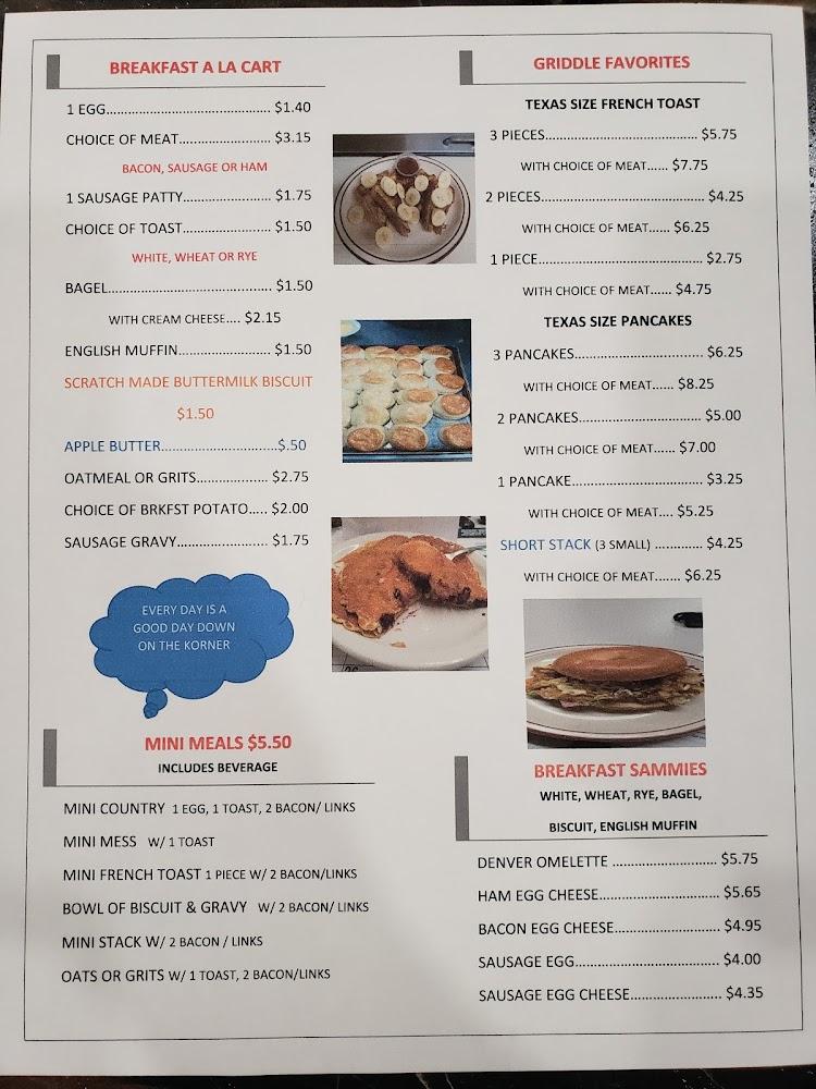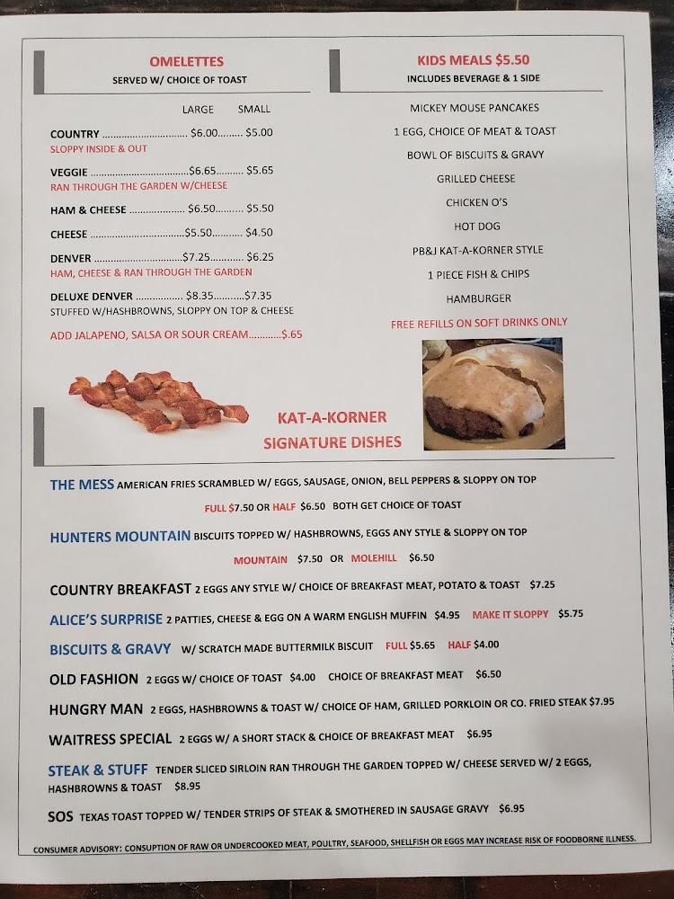 Kat A Korner Diner features a menu that celebrates comfort and tradition, offering a variety of tasty choices. Breakfast selections include hearty omelets, fluffy pancakes, and delectable biscuits and gravy. The lunch and dinner menus highlight signature dishes like the Beef Manhattan and Grandma's Meatloaf.